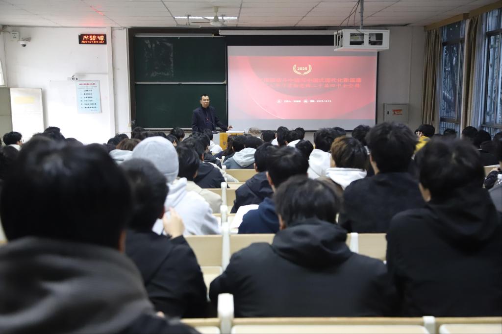 12月23日下午,副校长张旭辉在尚学楼102教室为120余名大一学生和马克思主义学院教师讲授题为《在接续奋斗中谱写中国式现代化新篇章——深入学习贯彻党的二十届四中全会精神》的形势与政策课。